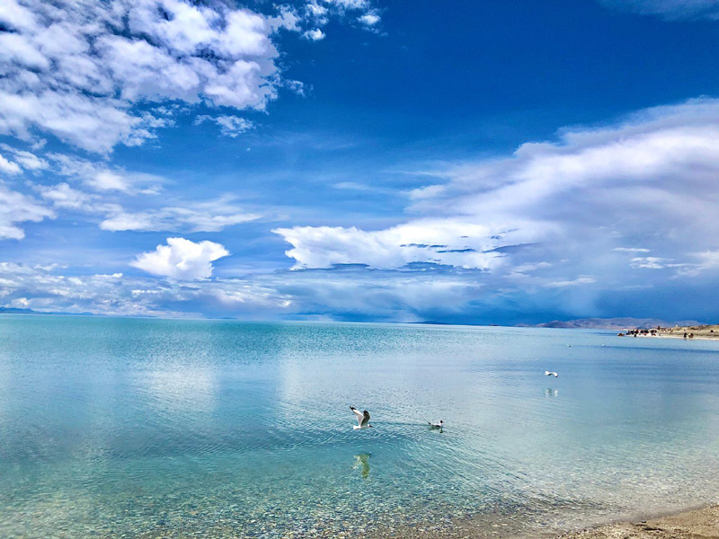 西藏的三大圣湖之一,湖面像一条飘带挂在天地之间,清澈的湖水、巍峨的雪山、如洗的蓝天和朵朵白云融为一体,词语匮乏了,只能用很美来总结了。